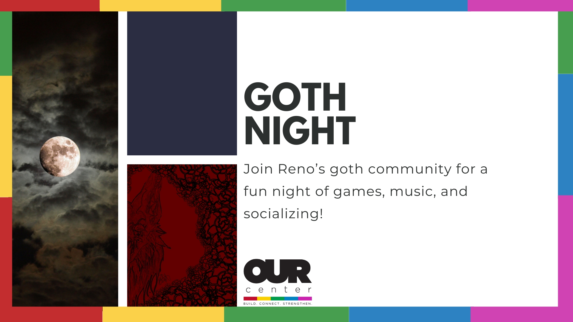 Join Reno’s goth community for a fun night of games, music, and socializing! Goth Night runs from 8 – 11PM every 3rd Friday of the month. Donations suggested at the door – donate food, cash, clothes, or hygienic items! This event is all ages.