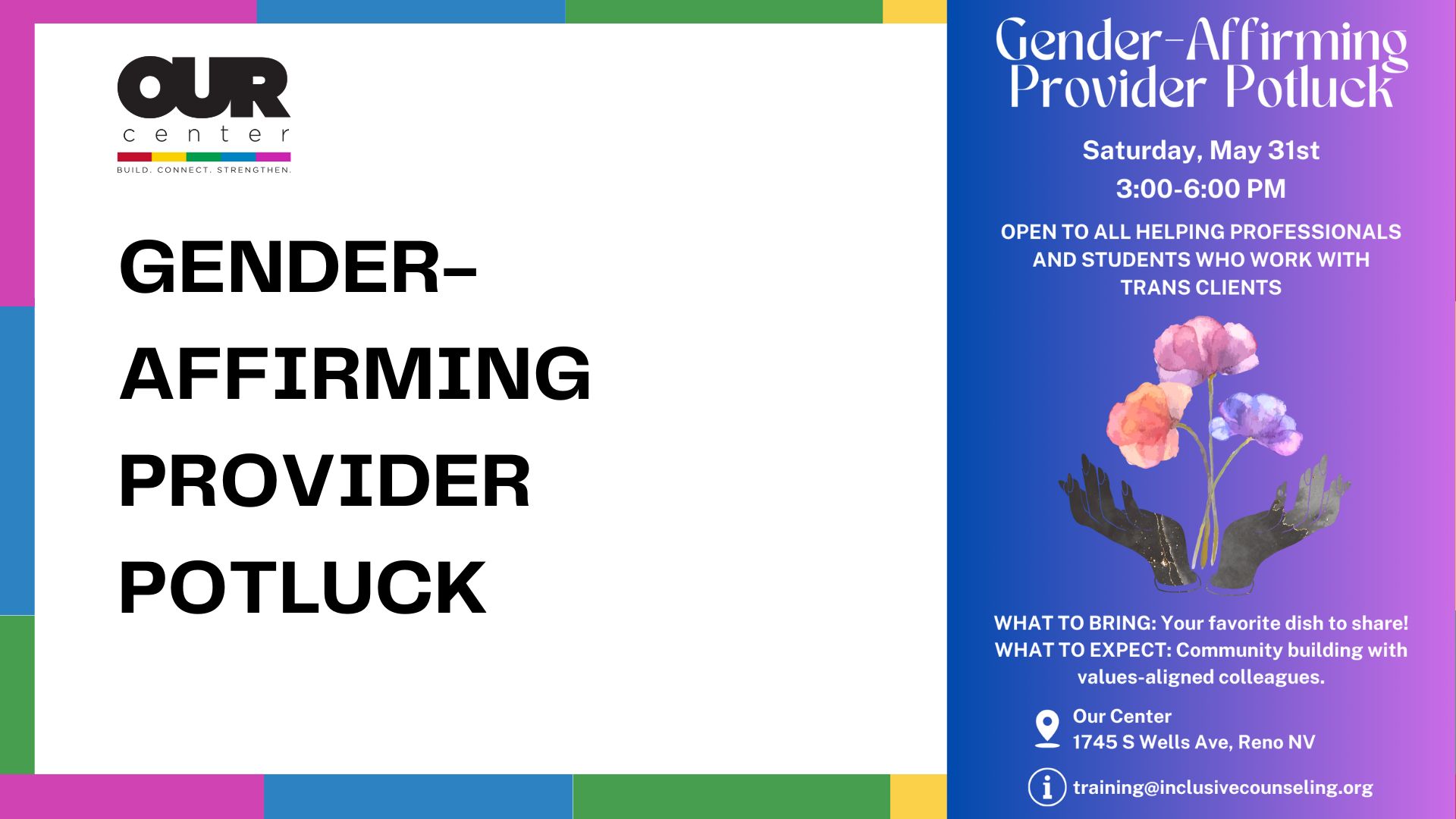 The potluck is a networking and community-building event for all providers who offer gender-affirming services to transgender folks, as well as students who are interested in gender-affirming care. Free! Bring your favorite dish to share.